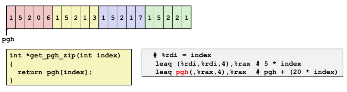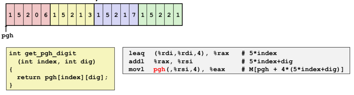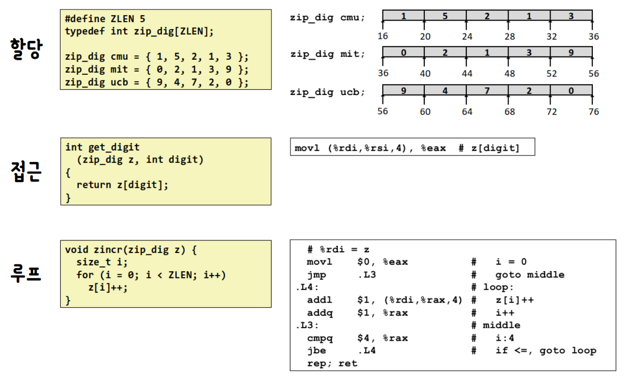 T A[L]; <- 자료형이 T인 데이터 L개로 이루어진 배열 A를 선언하는 문장이다. 배열의 할당은 어셈블리어 수준에서 메모리에 L x sizeof(T) 바이트를 연속적으로 할당함으로써 구현된다. 그리고 배열 요소의 접근은 어셈블리어 수준에서 배열의 첫 번째 요소를 가리키는 포인터인 A에 특정 인덱스 값을 더한 주소에 접근하는 방식으로 구현된다. A는 배열의 첫번째 요소를 가리키는 자료형이 T*인 포인터이다.