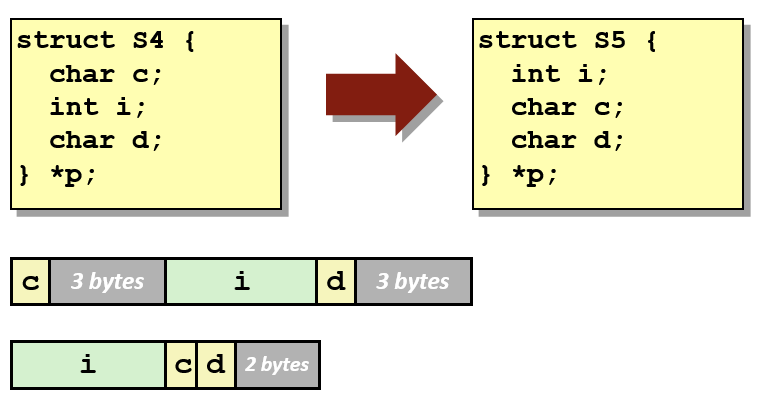 정렬 원칙(Alignment Principle). 사실 구조체 내 요소들은 완전히 연속적으로 할당되지는 않고 그 사이사이에 빈 공간이 존재하는데, 이는 성능 향상을 위한 정렬 원칙을 준수하기 위해서이다. 그리고 구조체의 정렬 원칙에 따르면 구조체 내 요소들을 크기가 큰 것부터 선언해야 공간을 가장 효율적으로 쓸 수 있다는 결론에 도달한다.