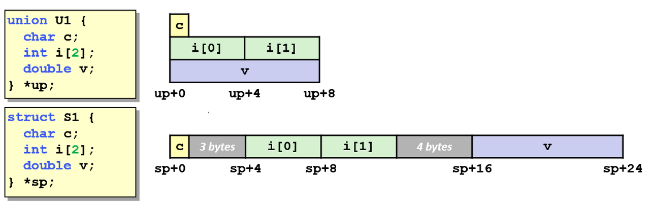 구조체도 배열과 마찬가지로 요소들이 메모리 공간에 연속적으로 할당되며 할당이 되는 순서는 구조체 내에서 선언되는 순서를 그대로 따른다. 컴파일러는 단지 해당 구조체의 전체 크기와 내부 요소들 각각의 위치 정보(offset)을 파악한 뒤 이를 바탕으로 구조체를 할당하고 접근하는 기계어 코드를 만들어 낸다.