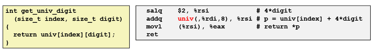 두 번째는 univ[i][j]에 접근할 때 메모리 접근이 2번 필요하다는 것이다. 즉, 먼저 univ[i]에 저장되어 있는 포인터를 읽고나서, 그 것에 인덱스 값을 더하여 얻은 주소로 다시 접근해서 값을 가져와야 하기 때문이다.