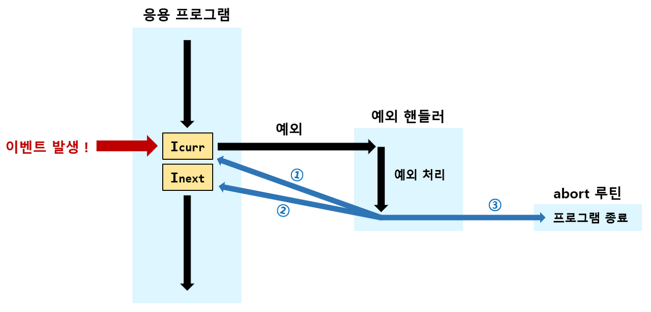 프로세서는 특정 이벤트의 발생을 감지하는 순간에 예외 테이블이라고 불리는 점프 테이블을 참조해서 해당되는 예외 핸들러로의 간접 프로시저 호출을 수행한다. 그렇게 호출된 예외 핸들러가 처리를 마치면 다음 3가지 동작 중 하나를 수행하게 된다. 여기서 어떤 동작을 수행할지는 예외의 종류에 따라 결정된다.
