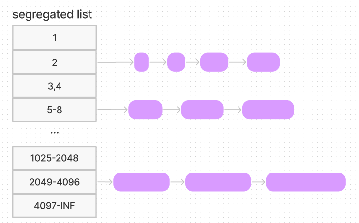 이런 size class를 정의하는 많은 방법들이 존재하는데, 블록 크기를 2의 제곱으로 나눌 수도 있고, 크기가 작은 블록들은 자신의 크기 클래스에 할당하고, 큰 블록들은 2의 제곱으로 분리할 수도 있다.이렇게 할당기는 free list의 배열을 관리하고, size class마다 크기가 증가하는 오름차순 순서로 하는 연결 리스트들을 가진다.