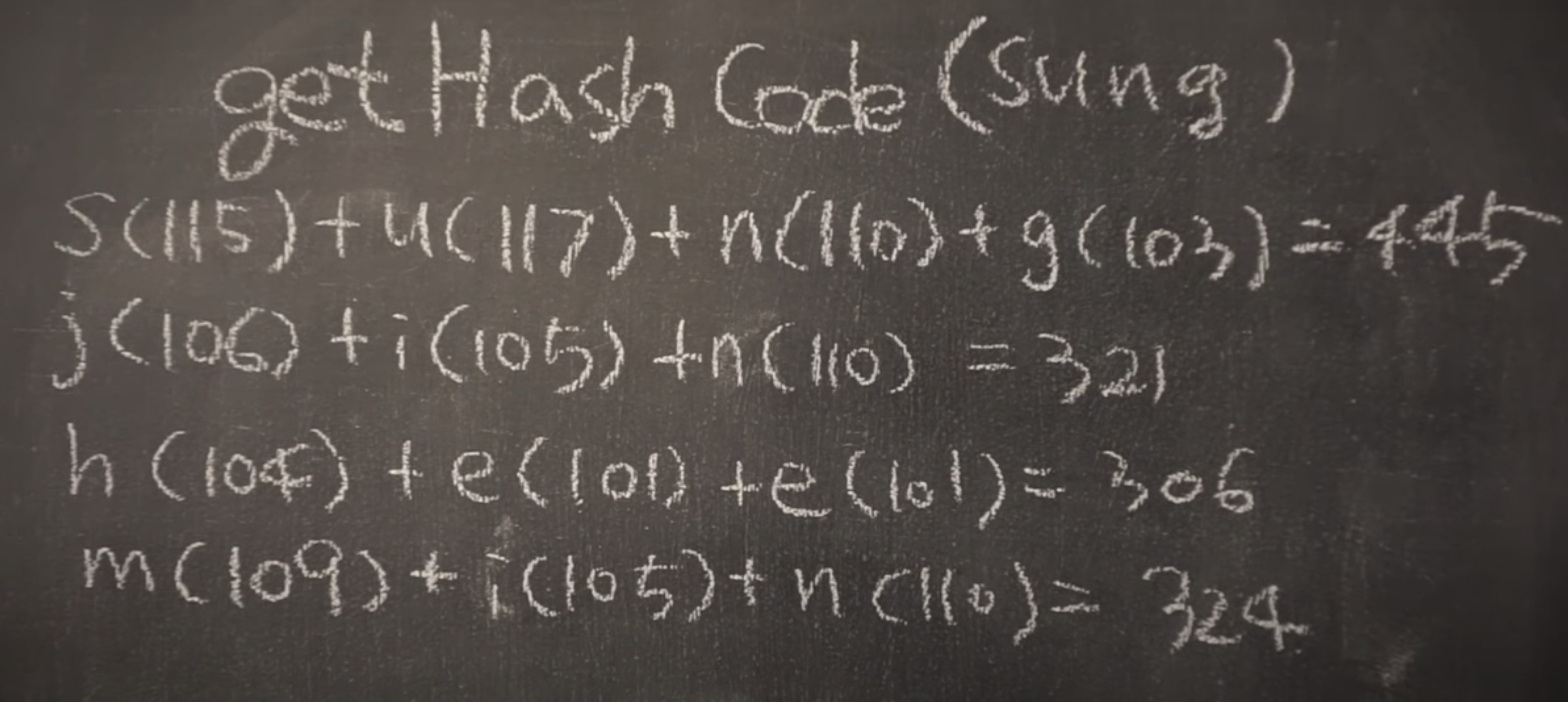 먼저 키를 입력받고, hash code를 반환하자. 이때, 각 문자를 아스키 코드 값으로 변환해서 해시코드를 만든다.