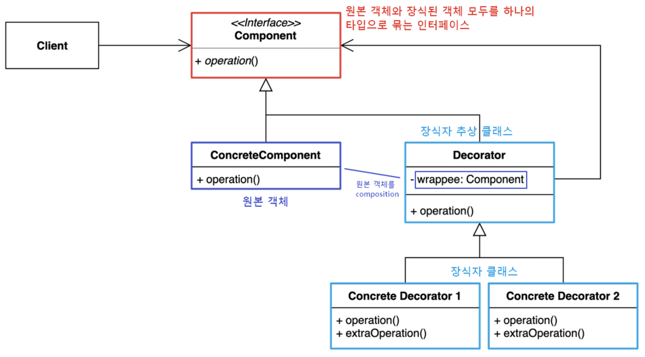 위 패턴을 보면 위에 있는 3가지 패턴을 보면 Composite Pattern과 똑같다. 이때, Decorator는 Component를 가질 수 있고, 이 말은 즉 Component를 상속받고 있는 것들을 가질 수 있다는 말이다.
