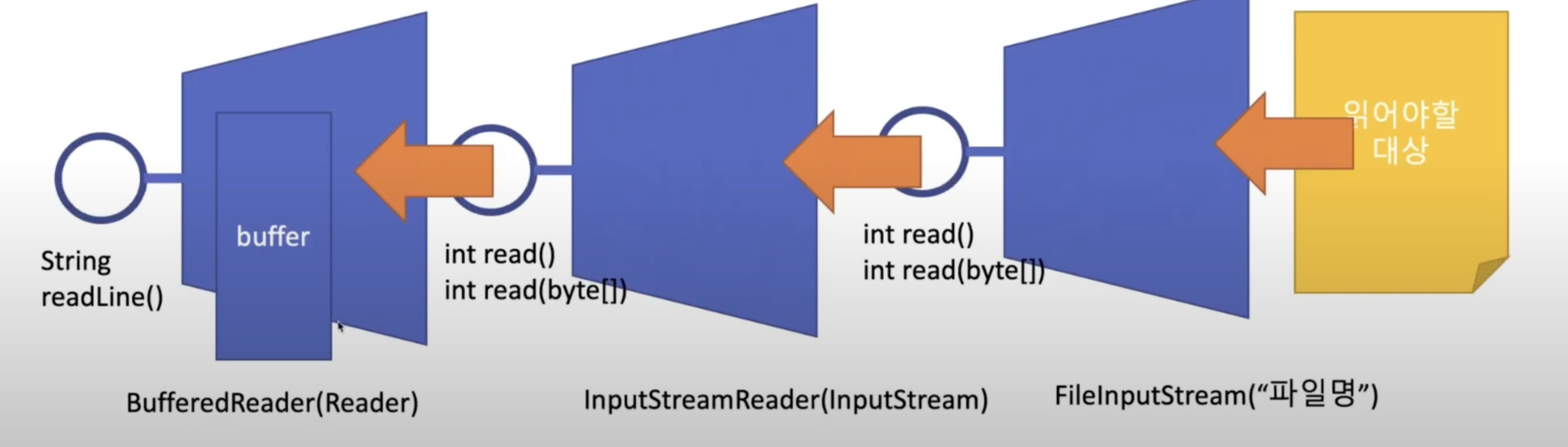 위 그림처럼 InputStreamReader를 호출하면, 생성자에 들어온 InputStream의 read 메서드를 호출한다. 그렇게 파일로부터 2바이트를 읽어서 문자로 변환되어서 2바이트가 나오는 것이다. 그리고 BufferedReader는 내부적으로 buffer를 가지고있다. 이때, readLine을 호출하면 생성자에 들어온 Reader의 read메서드를 호출한다. 그렇게 한줄이 채워질 때까지 read를 호출하고 한줄이 채워지면 문자열을 반환한다.