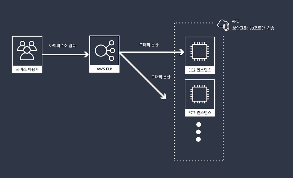 우선 로드 밸런싱을 사용하지 않는다면 다음 그림과 같이 우리는 각 EC2 인스턴스에 고정된 아이피를 부여해야 한다. 문제는 하나의 인스턴스에 하나의 도메인밖에 연결할 수 없는데, 서버에 많은 트래픽이 몰리면 서버의 사양을 올리는 스케일 업, 서버의 개수를 늘리는 스케일 아웃을 고려해야 한다는 것이다. 이때, 로드 밸런싱을 사용하지 않는다면, 스케일 업의 경우 인스턴스를 업데이트하는 동안에 서비스를 할 수 없는 문제가 발생하고, 스케일 아웃을 하면 서버가 늘어날 때마다 도메인이 새로 필요하다는 문제점이 발생한다.