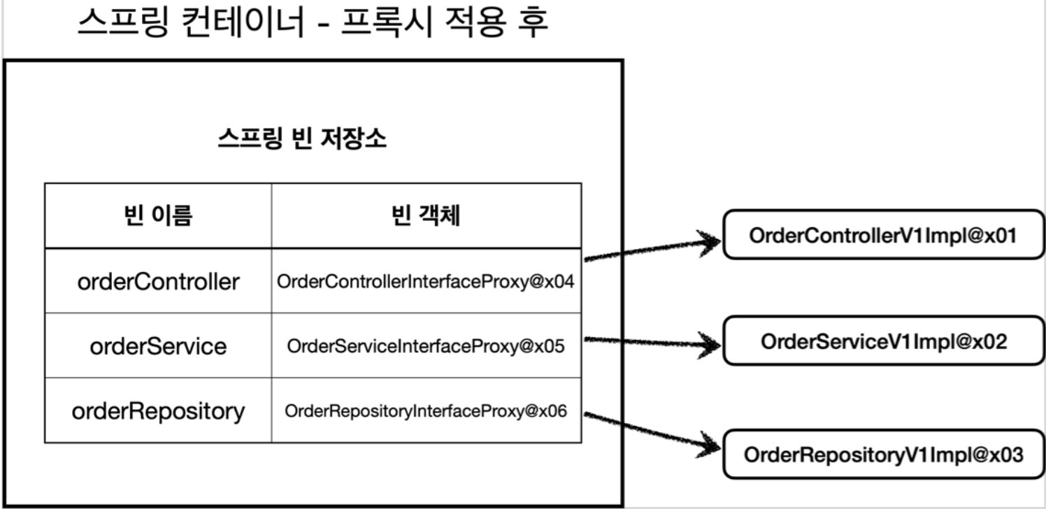 즉, 프록시 적용 전에는 스프링 컨테이너에 실제 객체가 스프링 빈으로 등록되고, 프록시 적용 후에는 스프링 컨테이너에 프록시 객체가 등록되는 것이다. 따라서 스프링 컨테이너는 실제 객체가 아니라 프록시 객체를 스프링 빈으로 관리한다.