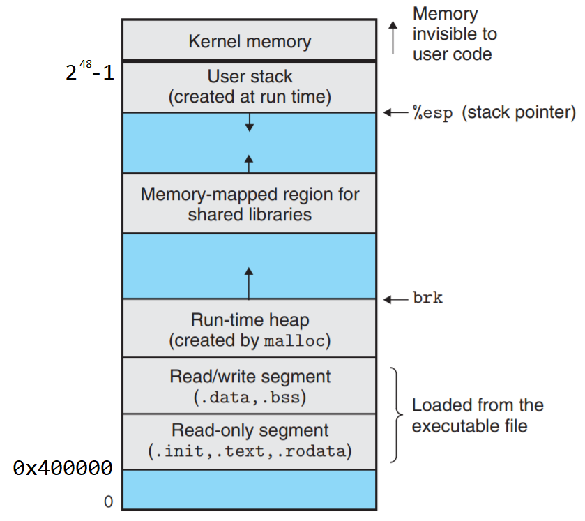 다음은 x86-64 리눅스에서 실행되는 모든 프로그램의 런타임 메모리 이미지이다.