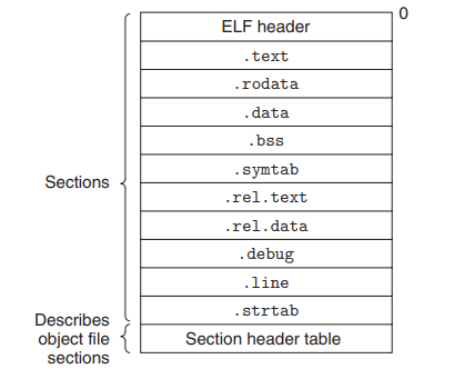 여기서 ELF란 Excutable and Linkable File을 나타낸다. 그리고 위 그림은 전형적은 ELF 재배치 가능 목적파일의 포맷을 보여준다. ELF 헤더는 이 파일을 생성한 워드 크기와 시스템의 바이트 순서를 나타내는 16바이트 배열로 시작한다. 그리고 헤더의 나머지는 링커가 목적파일을 구문분석하고 해석하도록 하는 정보를 포함한다. ELF 헤더와 섹션 헤더 테이블 사이에 섹션 내용이 들어 있는데, 전형적인 ELF 재배치 가능 목적파일은 다음과 같은 섹션들을 포함한다.